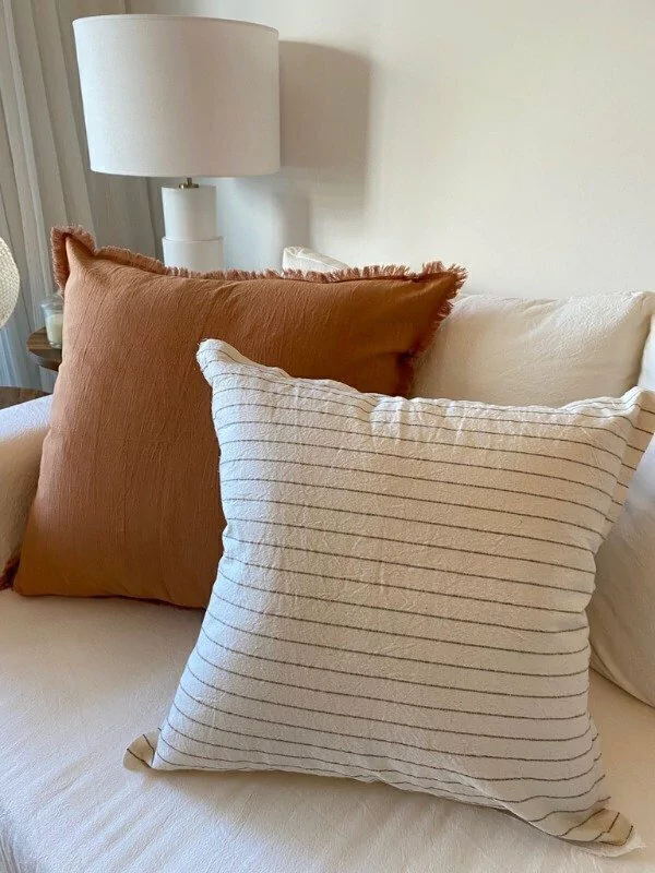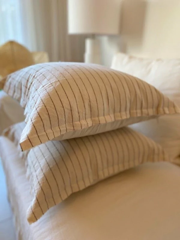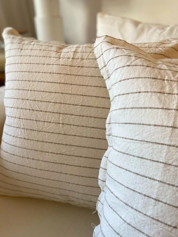 Almohadón de tusor petra color natural con rayas en el frente y tusor natural liso en la parte de atrás, con pestaña